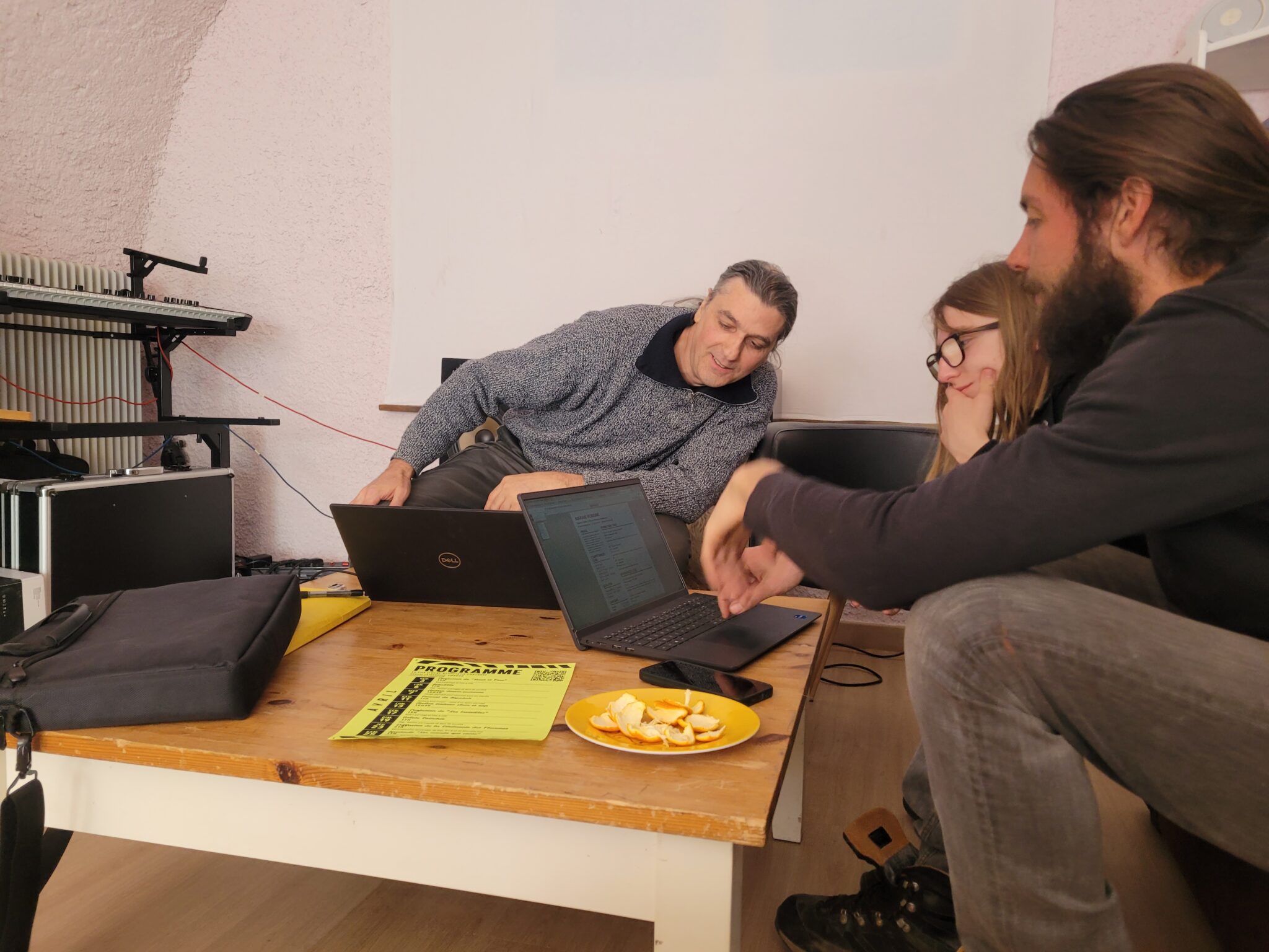 C’est un mini tiers-lieu, une salle voûtée de 30m² dans un espace déjà bien optimisé malgré une ouverture récente, début janvier. À l’entrée, un comptoir permet d’accueillir les curieux. Plus loin, cohabitent un home studio d’enregistrement, un bureau truffé d’outils de mesure et de réparation, et des canapés, points d’atterrissage de discussions animées et de participants aux ateliers.