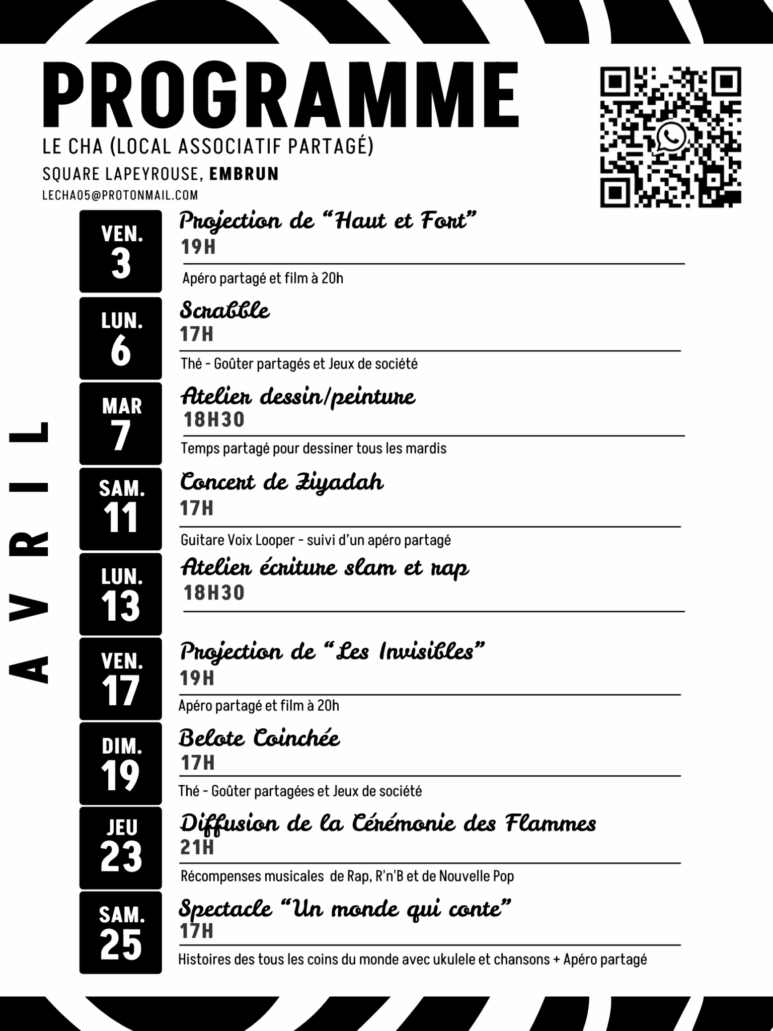 Programmation des animations du Cha d’avril 2026